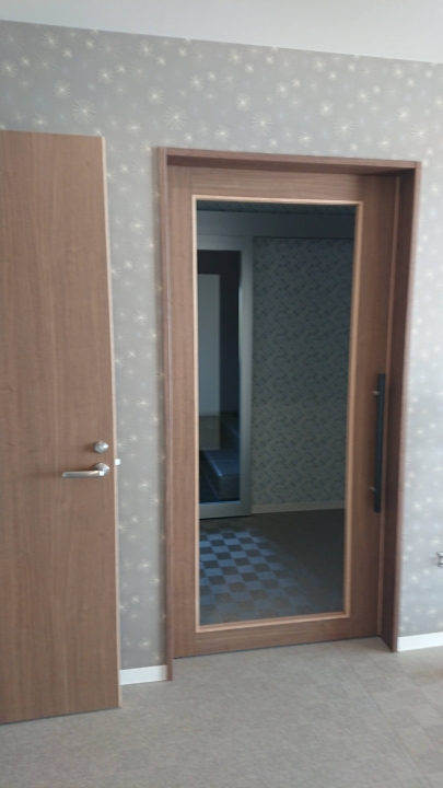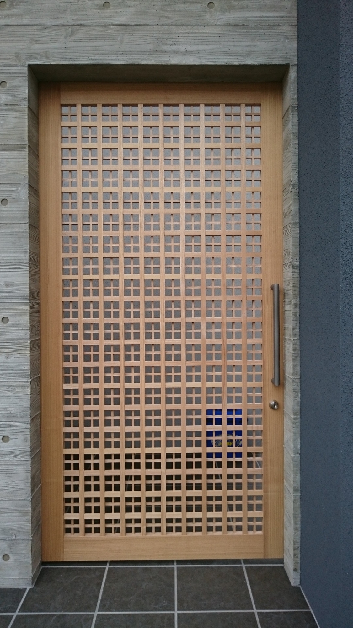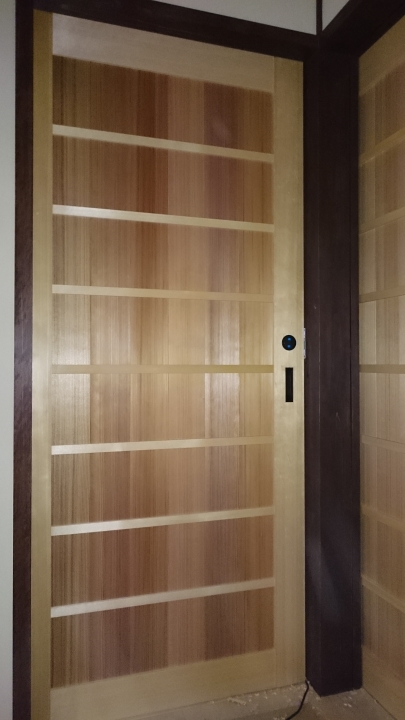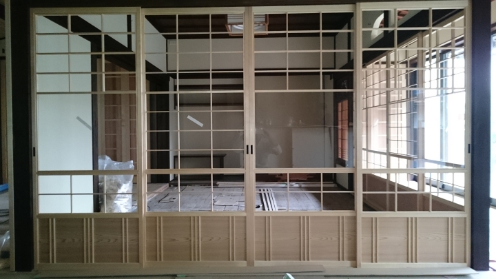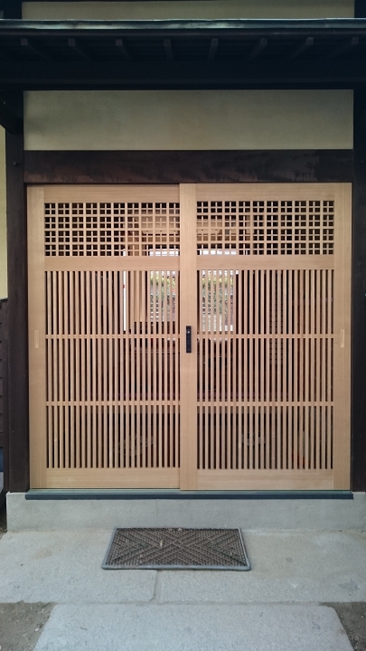 製作建具② 表と裏で格子が異なる変形格子です。御覧の通り繊細な造り。印象的な建具です。 和風カフェ玄関 上部の変形格子。下部は縦格子。職人の技が際立つ建具です。 某老人ホーム。舞良戸。入居者様の心地よさを思い丁寧に作製しております。 腰付き障子。和風建具そのもの。和の心に触れられる建具です。